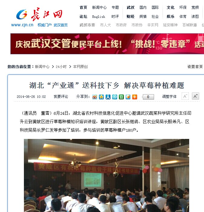 6月24日,湖北省农村科技信息化促进中心邀请武汉蔬菜科学研究所主任司升云到黄陂区进行草莓种植知识培训讲座,黄陂区副区长张翅鸽、区农业局局长殷希凡、区科技局局长罗仁发等参加了培训,参与培训的草莓种植户180户。